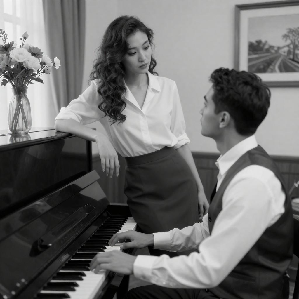 Black-and-white photograph of an Asian man and woman standing by a railing outdoors near a river or waterfront. The man, wearing a light-colored suit and white shirt, is gently holding a strand of the woman's long dark hair. The woman, dressed in a white long-sleeve top and floral skirt, stands with her arms crossed looking away. A bridge and bench are visible in the background.