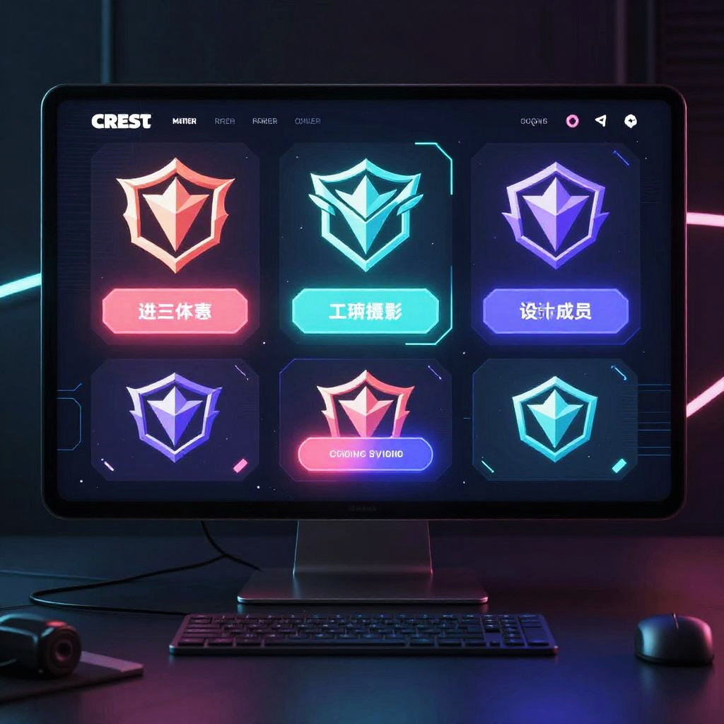 Crest maker free online platform visual, futuristic digital workspace with glowing interfaces, various emblem shapes and motifs displayed, interactive buttons, neon color palette, sharp geometric patterns, technology-enhanced creativity, polished and dynamic presentation.