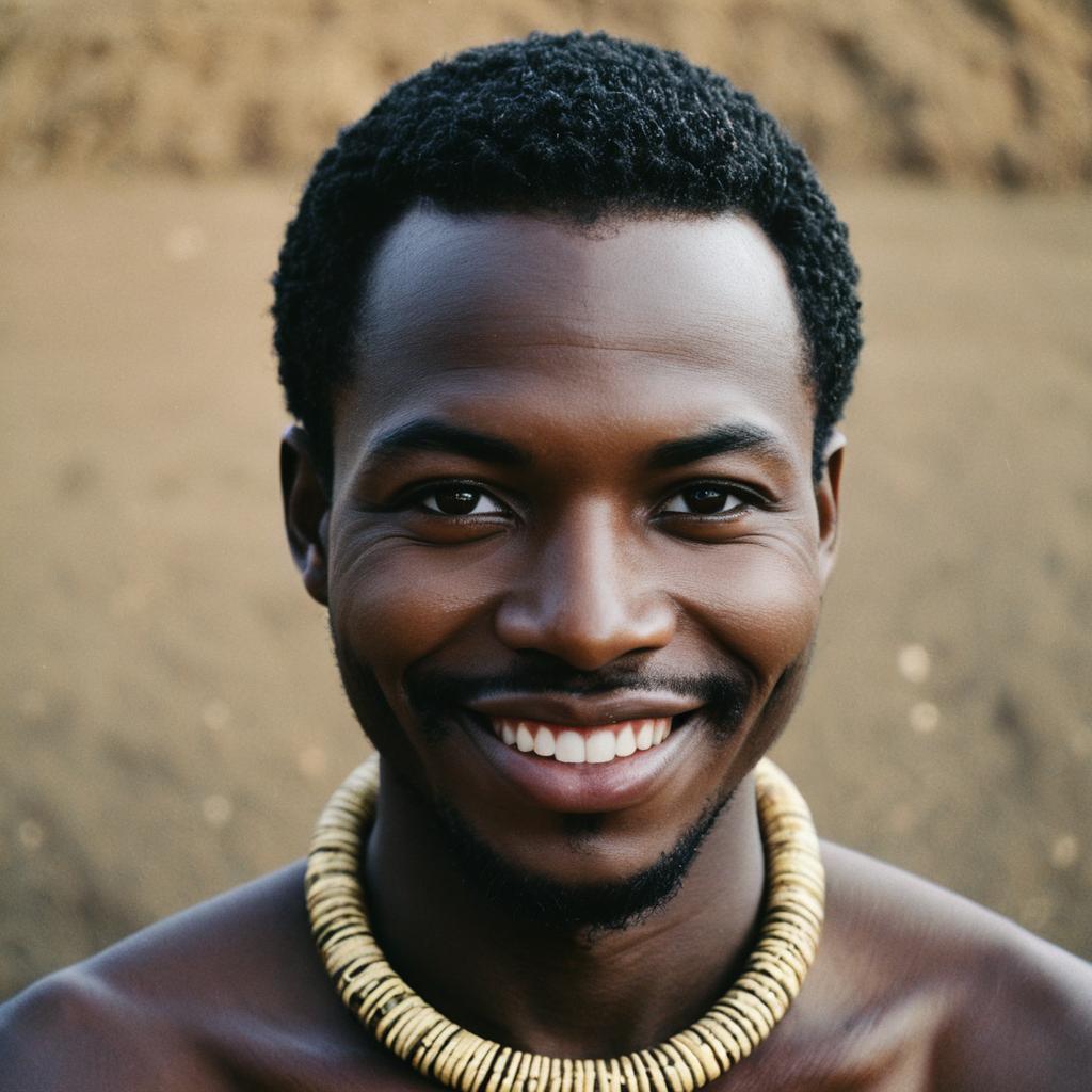 Close-up portrait of a smiling East African man with short coiled black hair and smooth dark skin, wearing a traditional beaded necklace. The background is blurred with natural earthy tones, emphasizing his warm and inviting expression.