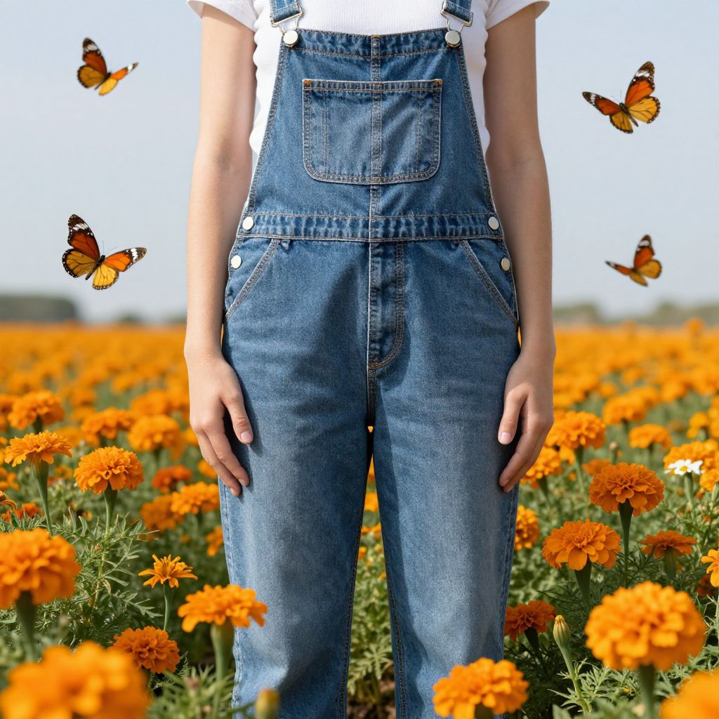 Photograph of a person from the waist down, standing in a vibrant orange marigold field. The individual wears blue denim overalls with white buttons, over a white short-sleeved shirt. Their hands rest by their sides. Bright orange and black butterflies are mid-flight around them. The background is a clear, sunny sky with a blurred horizon. The texture of the denim is slightly worn, contrasting with the softness of the marigolds and the delicate wings of the butterflies. The overall scene exudes a warm, summery, and natural atmosphere.