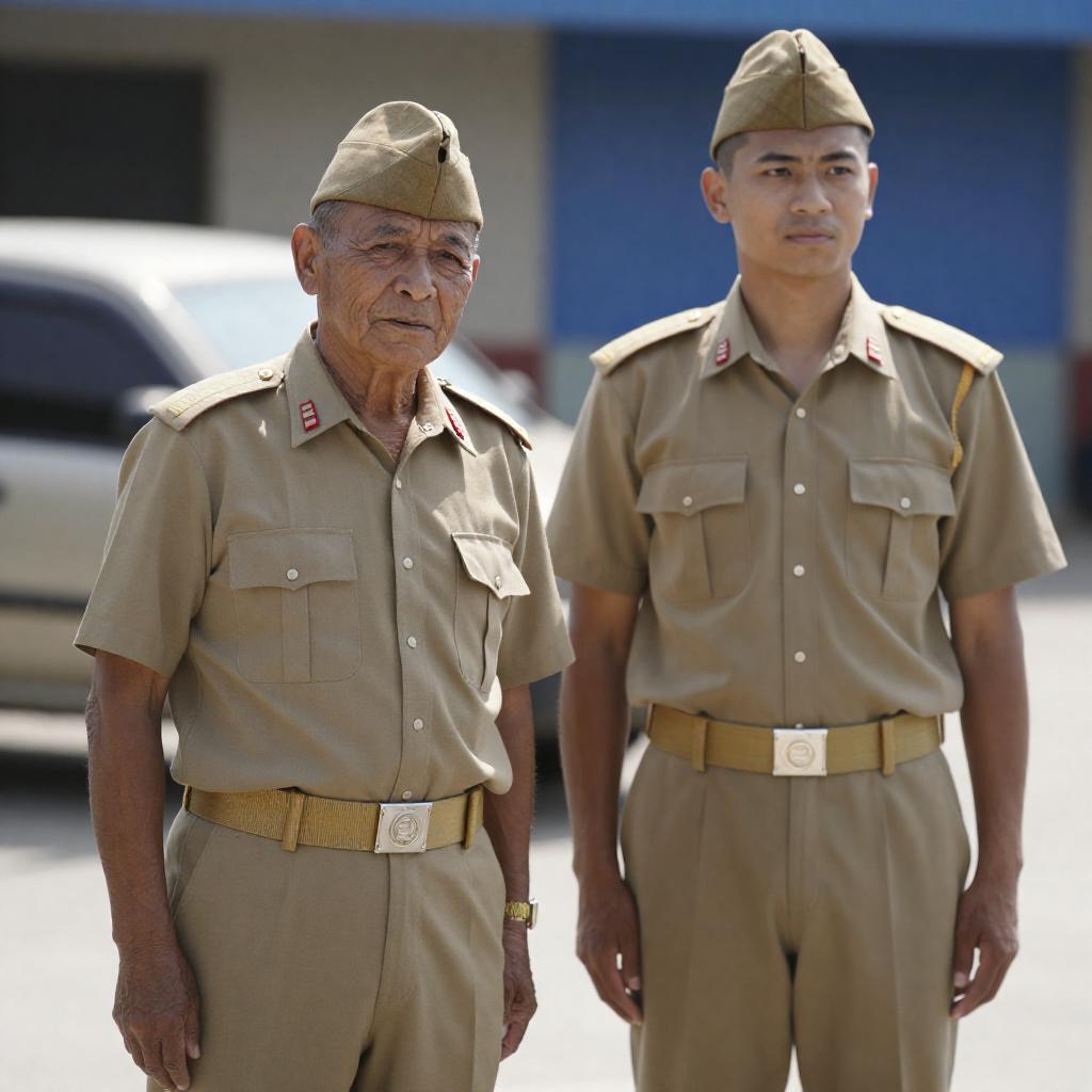 Photograph of two male military officers in beige uniforms and caps standing outdoors. The older officer on the left has a wrinkled face and slightly slouched posture, while the younger officer on the right stands taller and looks forward. Background includes a blurred vehicle and blue building. Bright sunlight casts shadows.
