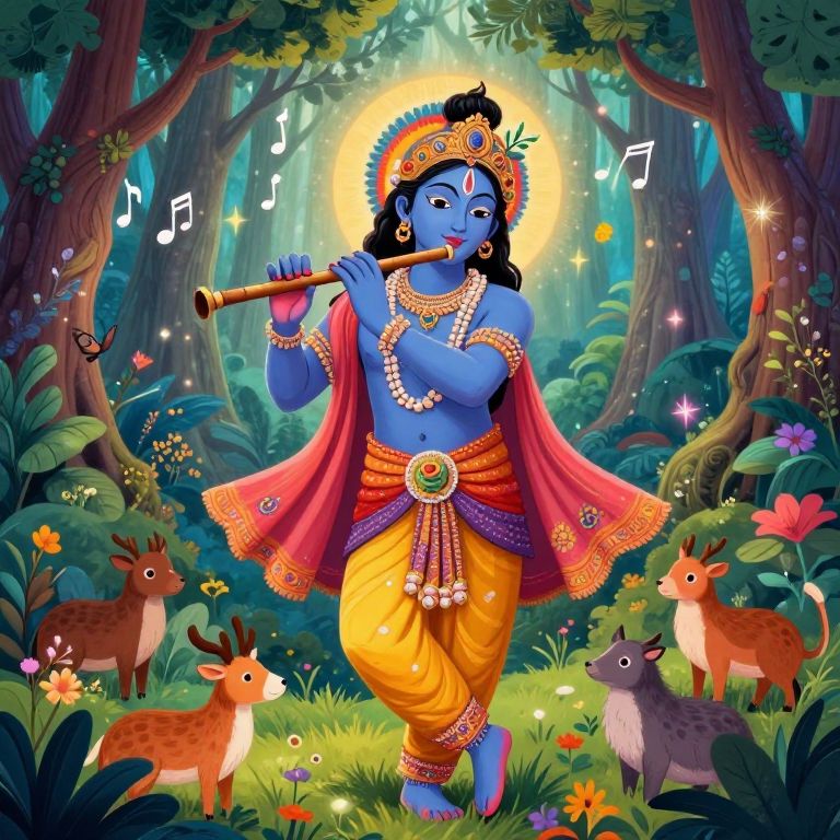 Khrishna illustrated in a vibrant, dreamlike forest scene, surrounded by animals and flora, playing flute with musical notes floating around, colorful and dynamic background with magical sparkles, intricate patterns on clothing, harmonious and peaceful vibe