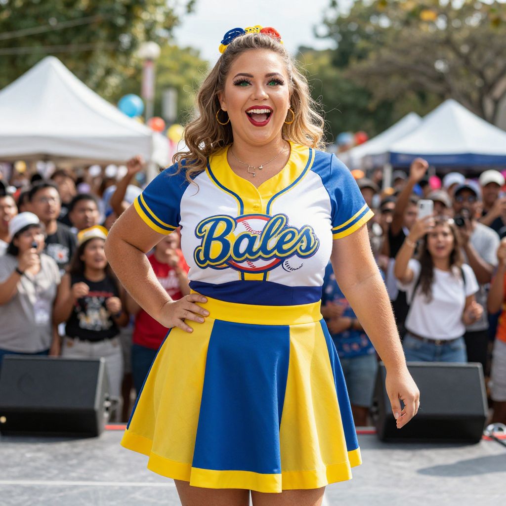 A colorful plus size baseball dress with yellow accents and a retro baseball logo, worn by a joyful woman with light brown skin, expressive green eyes, and a joyful grin, posing on a sunlit outdoor stage during a cultural street festival with fans cheering in the background.. The woman has big tits and cute face