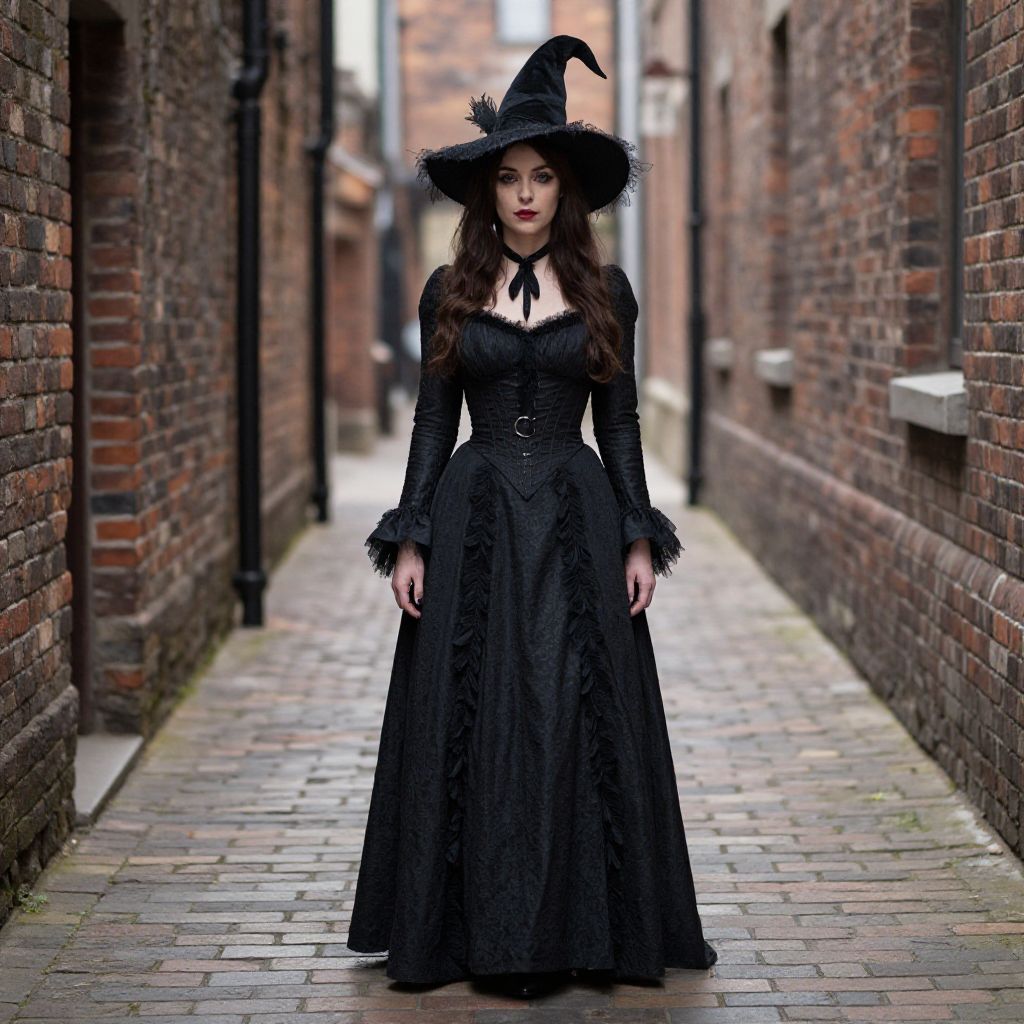 Photograph of a young woman in a black Victorian-style dress and witch hat standing in a narrow brick alleyway.