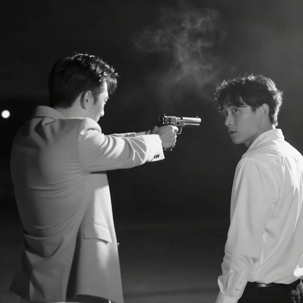 Black-and-white photograph of two men in a nighttime scene. The man on the left, with short dark hair, wears a light-colored suit and aims a gun at the man on the right, who has wavy hair, a white shirt, and looks back with a surprised expression. Smoke or light mist is visible in the background.