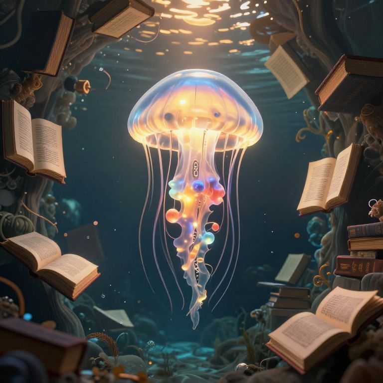 A digital CGI artwork depicts a glowing jellyfish with a translucent dome and vibrant, multicolored bell and tentacles, illuminated from within. Surrounding the jellyfish are open, floating books with visible text and bookmarks, suspended in a dark, underwater-like environment. The background is a deep blue, with scattered light reflections and underwater textures, including rocks and bubbles. The jellyfish's light contrasts with the dark surroundings, creating a magical, ethereal atmosphere. The books and jellyfish are positioned centrally, with the books arranged in a semi-circle around the jellyfish, enhancing the mystical, underwater library theme.