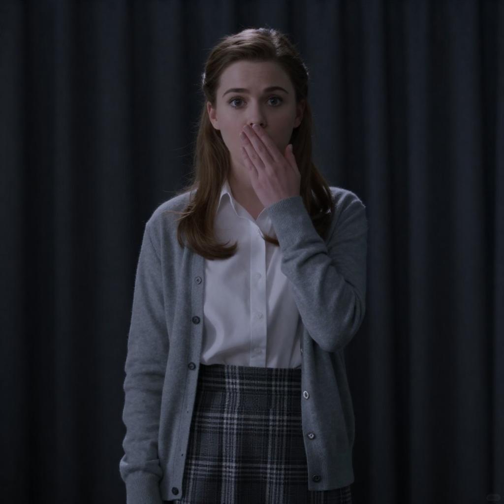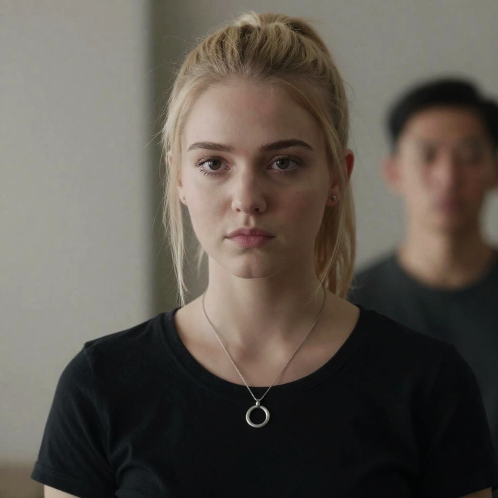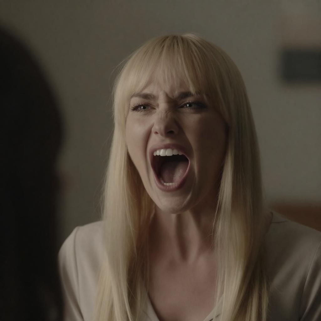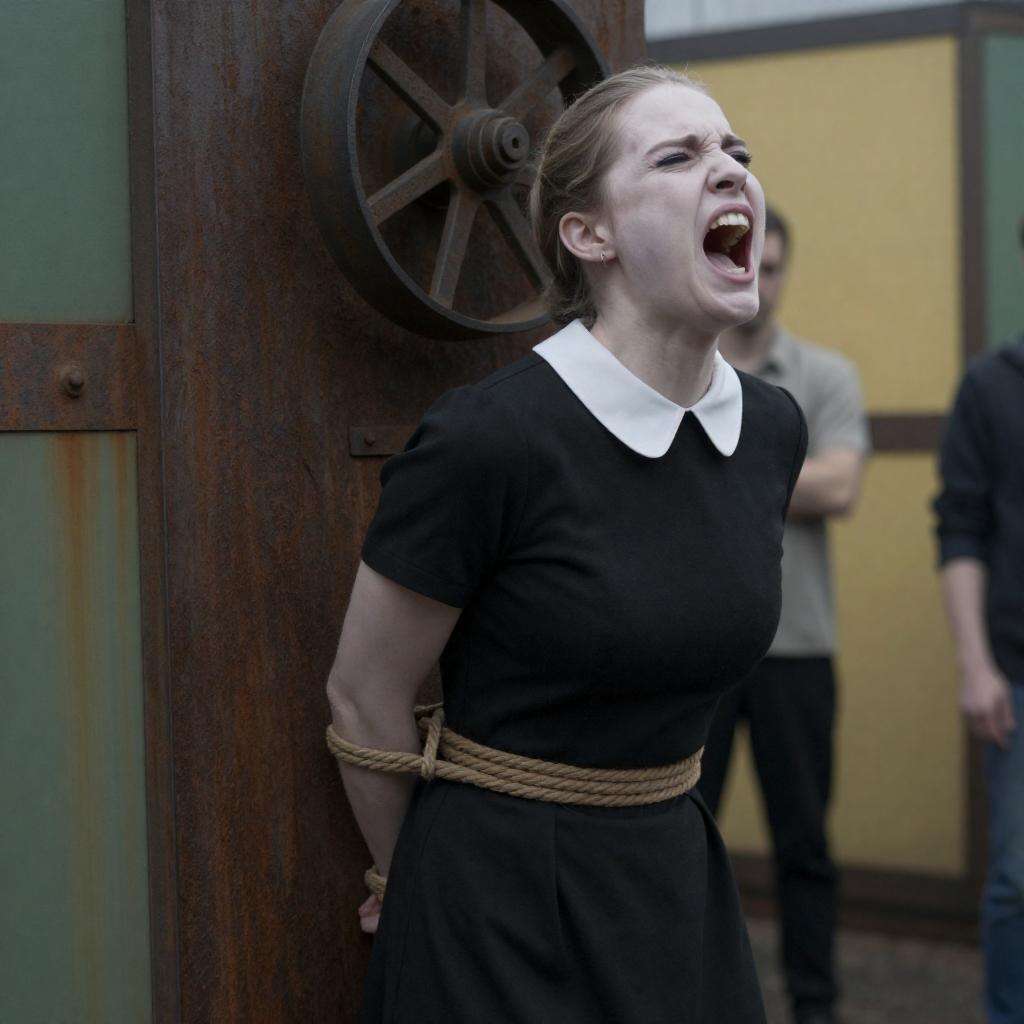 Photograph of a woman with pale skin, black dress, and white collar, screaming with mouth open, leaning against a rusty wall. Her hands are bound behind her back. A metal wheel is on the wall behind her. The background includes green and yellow panels. There are intense facial expressions and two people.