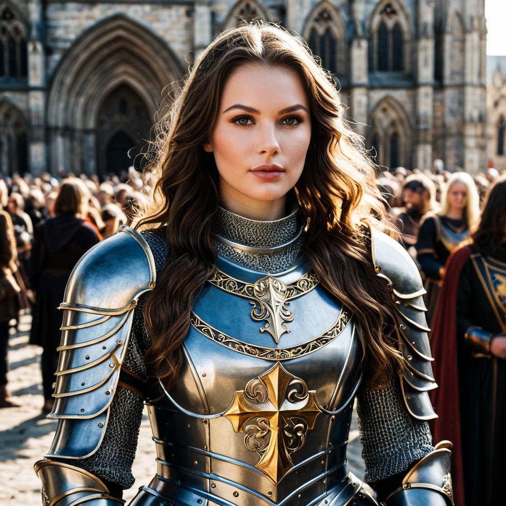 Portrait of a female knight with long wavy brown hair and blue eyes, wearing detailed silver and gold medieval armor with an intricate cross design on the chest plate. She stands in front of a gothic cathedral during daytime, with sunlight illuminating her armor. The slightly blurred background shows a crowd of people dressed in medieval clothing, enhancing the historical and fantasy atmosphere.