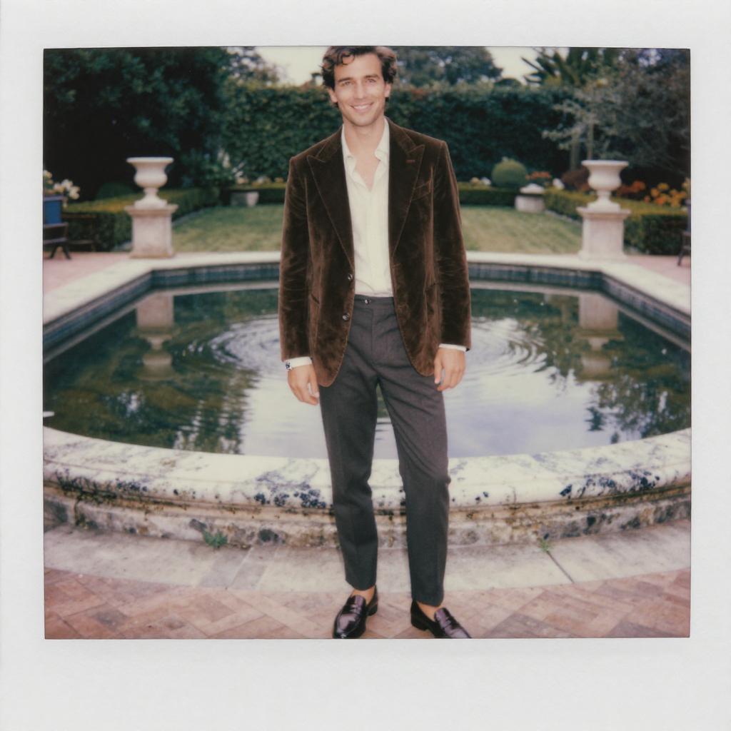 A man, deep burgundy tuxedo, slim fit, shawl collar, black silk dress shirt, black satin cummerbund, patent leather loafers, glistening bar, velvet lounge seating, instant film style, confident expression Man has masculine face and piercing eyes