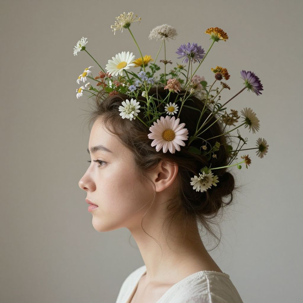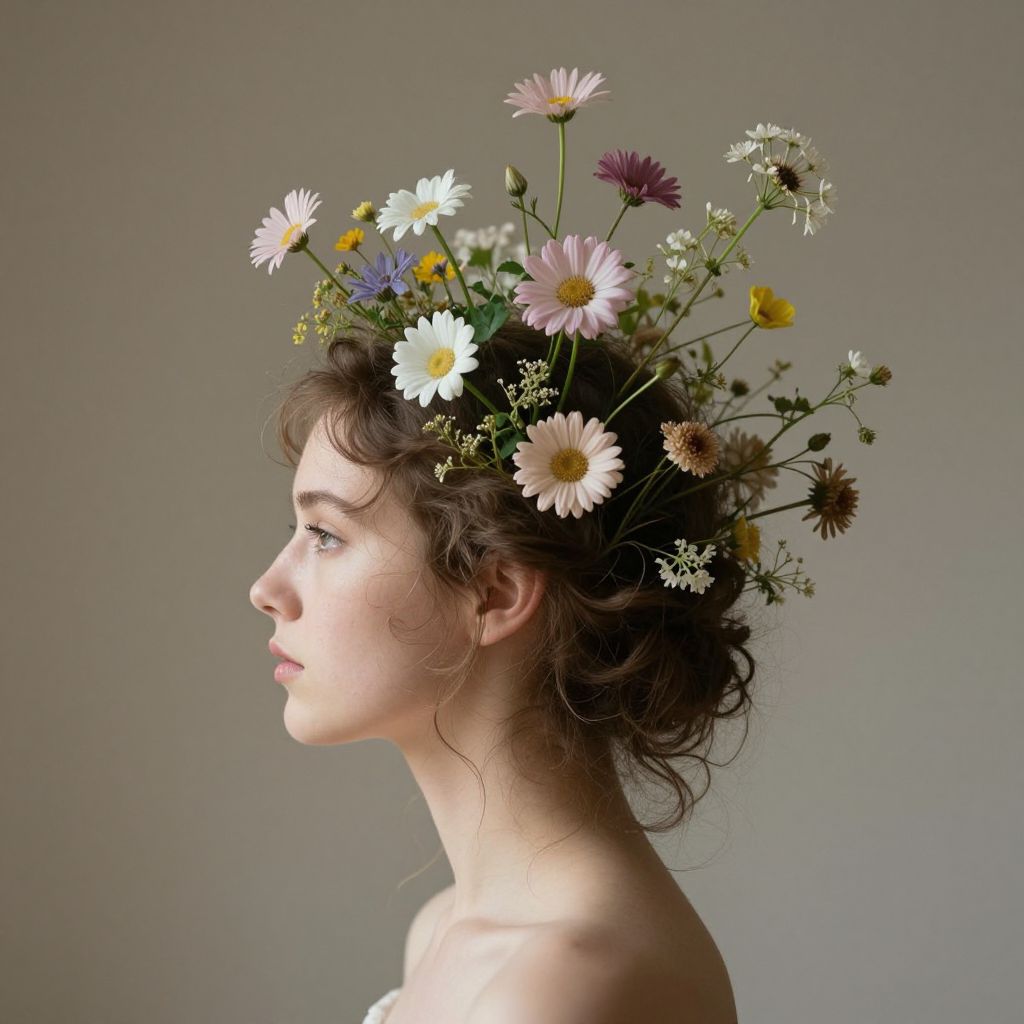 A woman's profile is adorned with a bouquet of delicate flowers sprouting improbably from her hair, defying natural growth patterns in a surreal, dreamlike fusion of human form and botanical beauty.