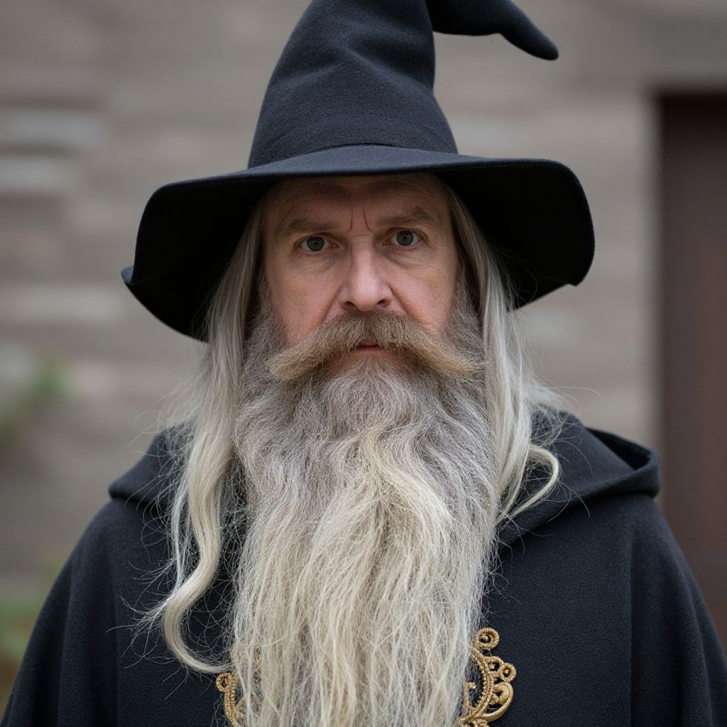 "Old Wizard Costume, a close up of a man with a long beard wearing a hat"