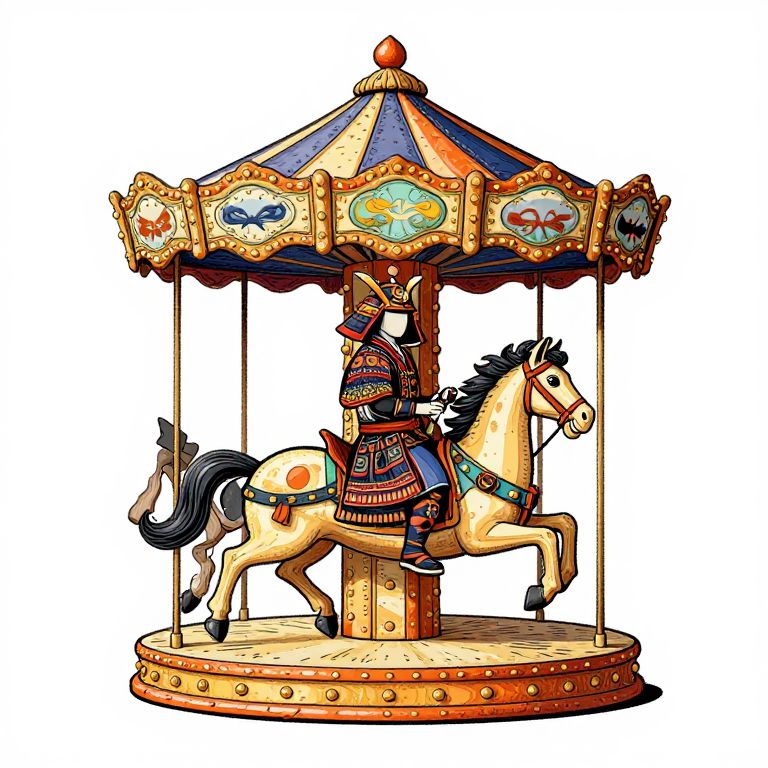 Samurai an illustrated white background with one hand-drawn halloween carousel, in an antique style, in halloween colors,