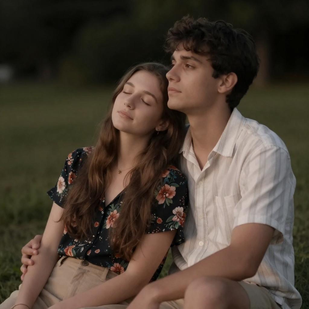Photograph of a young couple in a vintage orange car at night. The woman with light brown hair and a yellow top looks forward, while the man with short dark hair and a plaid shirt looks to the side. Bright marquee sign in the background reads "DISASTER 70." "DRIVE-IN" in yellow and red on the bottom right.