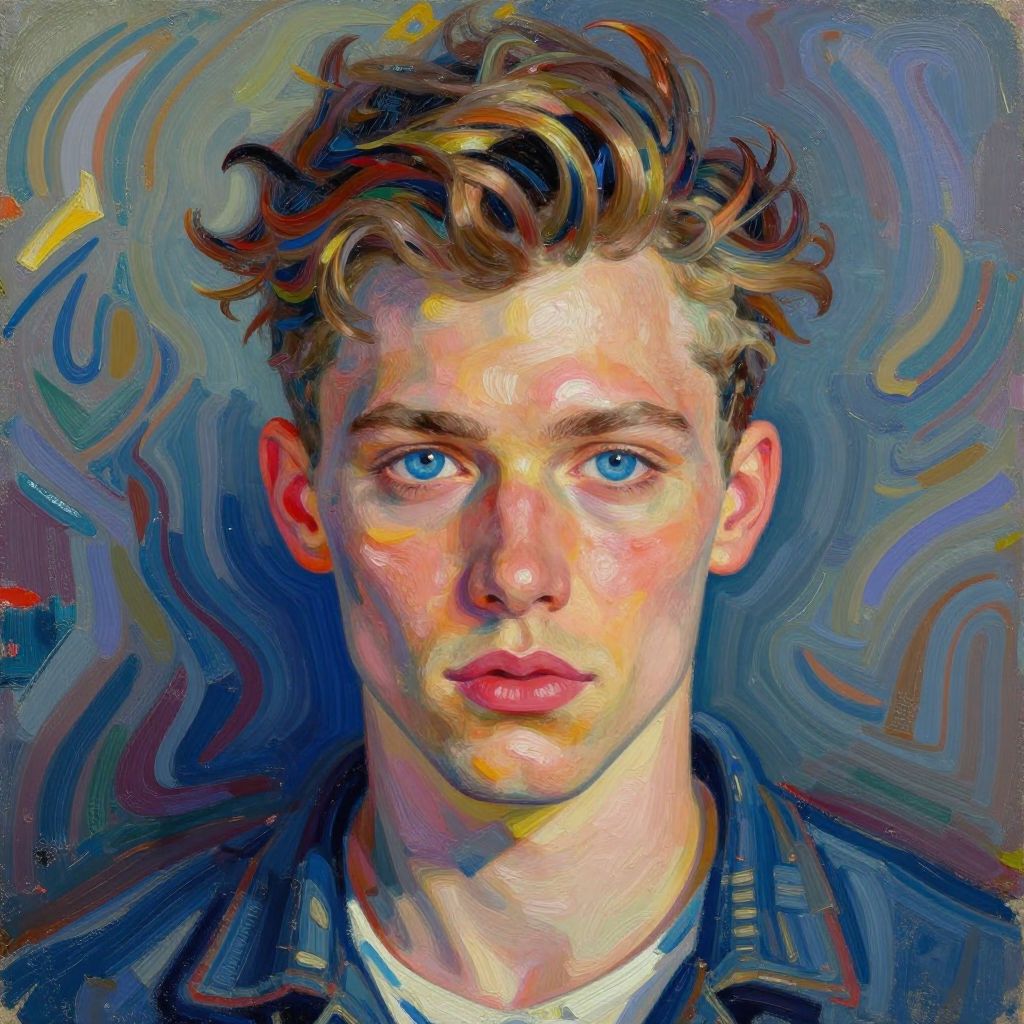 This vibrant portrait features a young man with striking blue eyes and stylish hair, set against a dynamic, abstract background of swirling colors. The artistic style is reminiscent of modern impressionism, emphasizing bold brush strokes and vivid hues that bring the image to life.