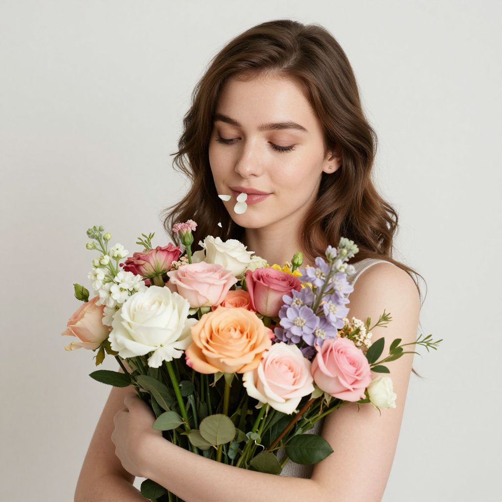 Photograph of a young woman with fair skin and wavy brown hair, wearing a white sleeveless top, holding a vibrant bouquet of roses and mixed flowers. The bouquet includes pink, white, and peach roses, along with small purple and white flowers. She has her eyes closed and a small piece of white candy in her mouth. The background is a plain white, making the colorful flowers and her serene expression stand out. She is holding the bouquet close to her chest with both hands. The image has a soft, natural light that highlights her gentle features and the delicate textures of the flowers.