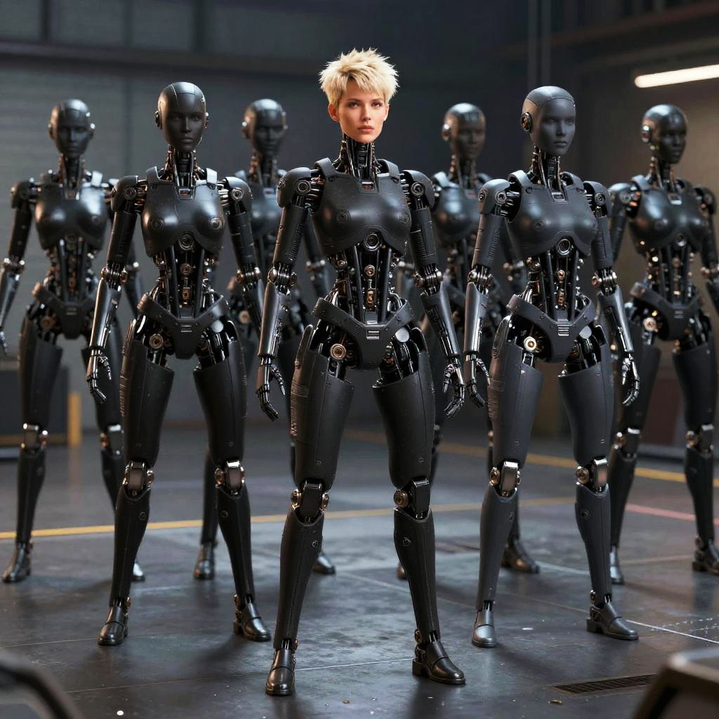 Blonde Woman Android Among Black Humanoid Robots