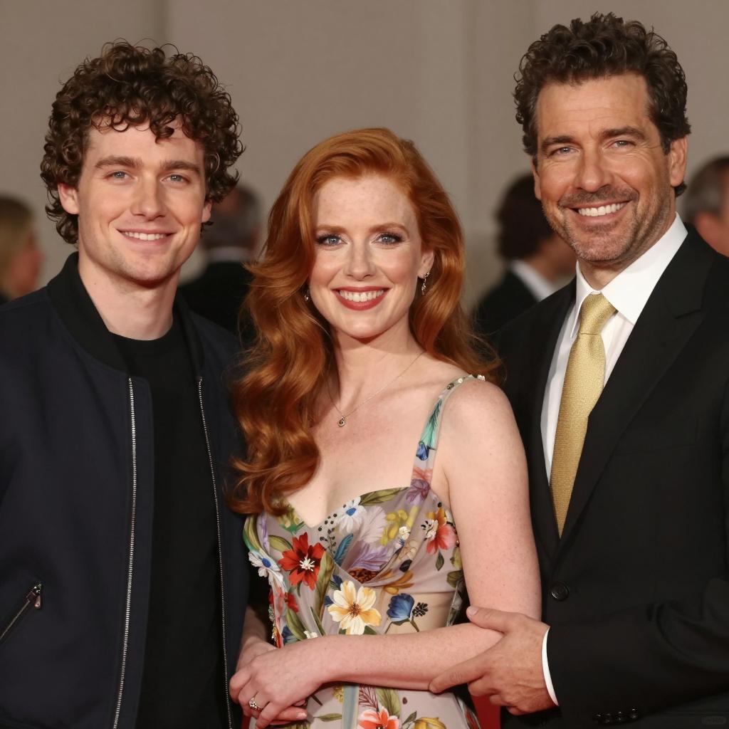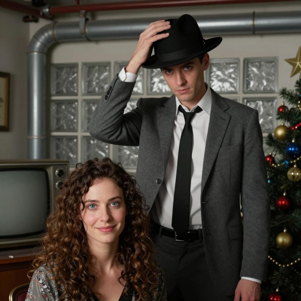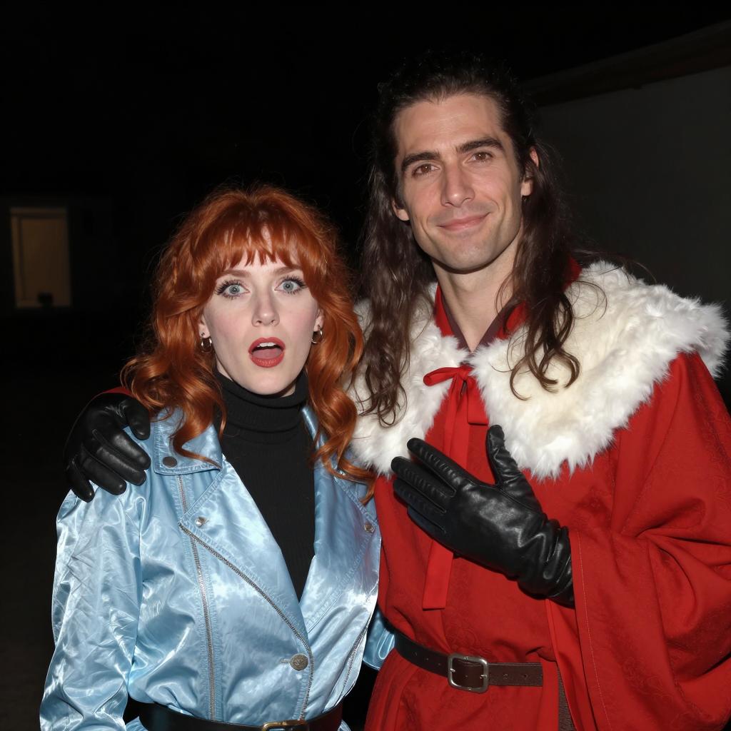 Photograph of two people at night. Woman with red hair, light blue shiny jacket, black turtleneck, looking surprised. Man with long dark hair, red robe with white fur, black gloves, arm around woman, smiling. Dark background with indistinct shapes.