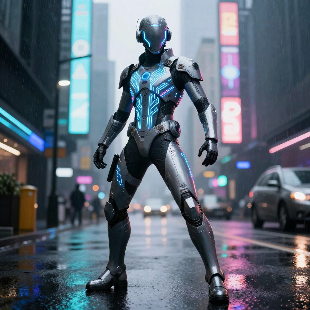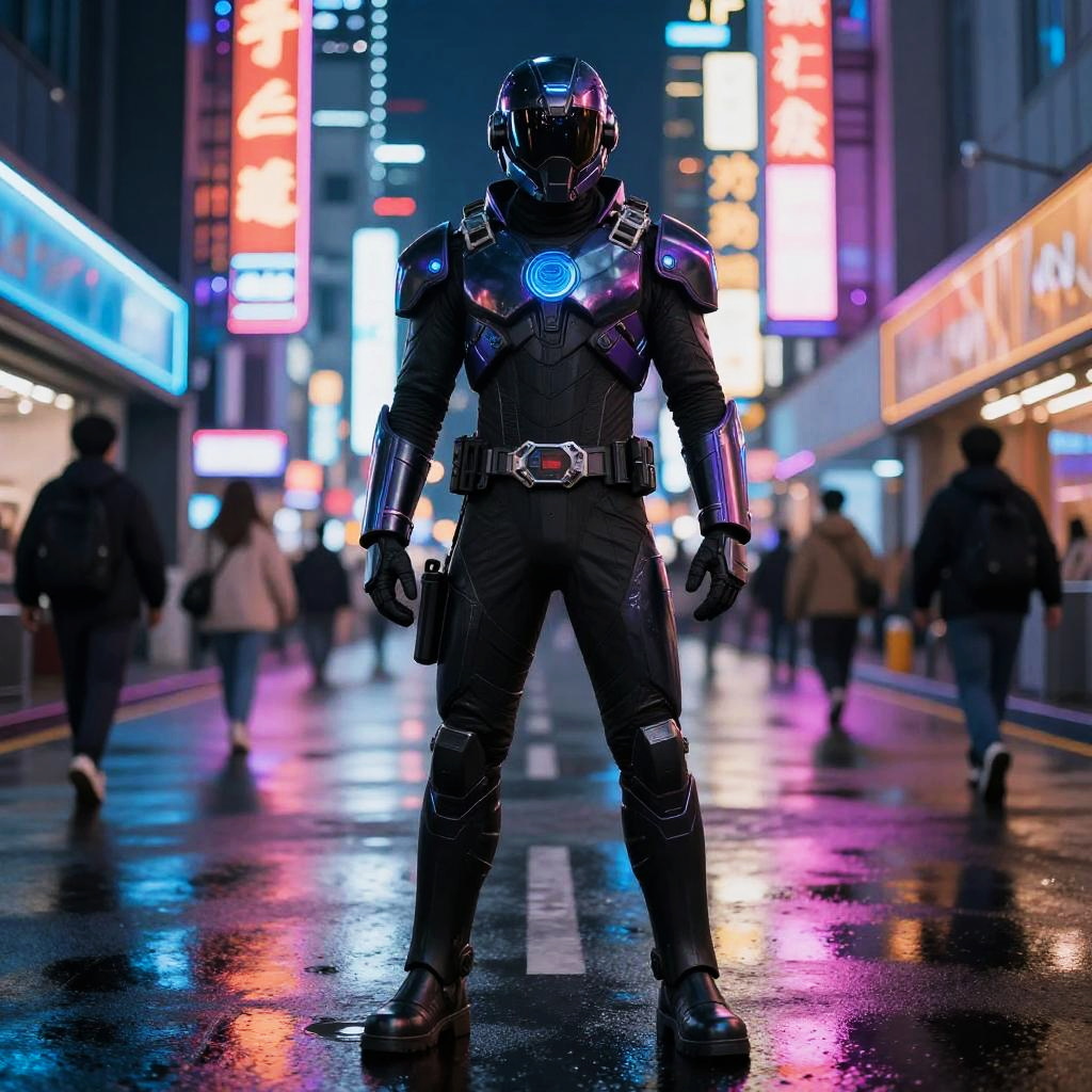 A futuristic, neon-lit city street scene with a person in sleek, black and purple armored suit standing confidently in the center. The suit has glowing blue accents and a helmet with a visor. The background is filled with vibrant, colorful neon signs and reflections on the shiny, wet pavement. Pedestrians are blurred in the distance, creating a bustling urban atmosphere. The image has a cyberpunk vibe.