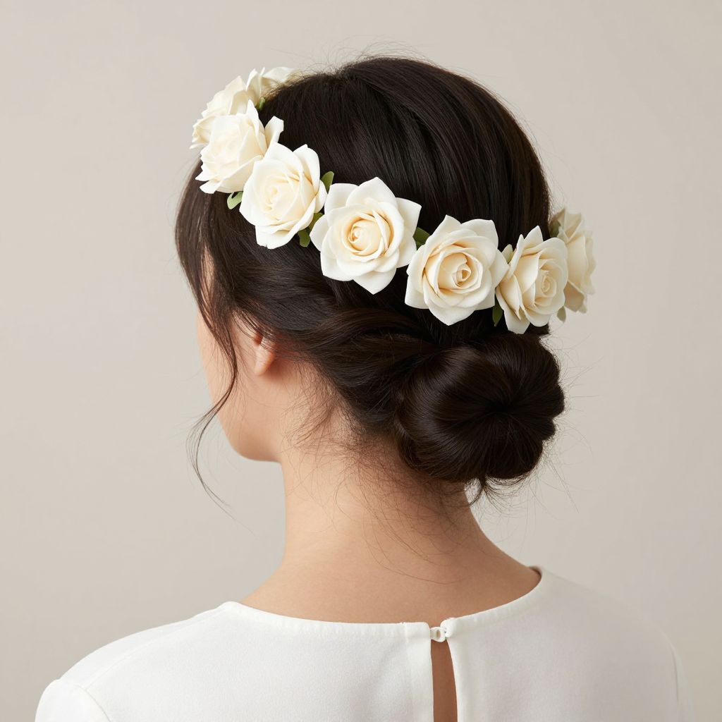 Elegant floral headband featuring seven cream-colored rose flowers adorns the neatly styled bun of a woman's dark hair, complementing her minimalist white top against a soft, neutral background.