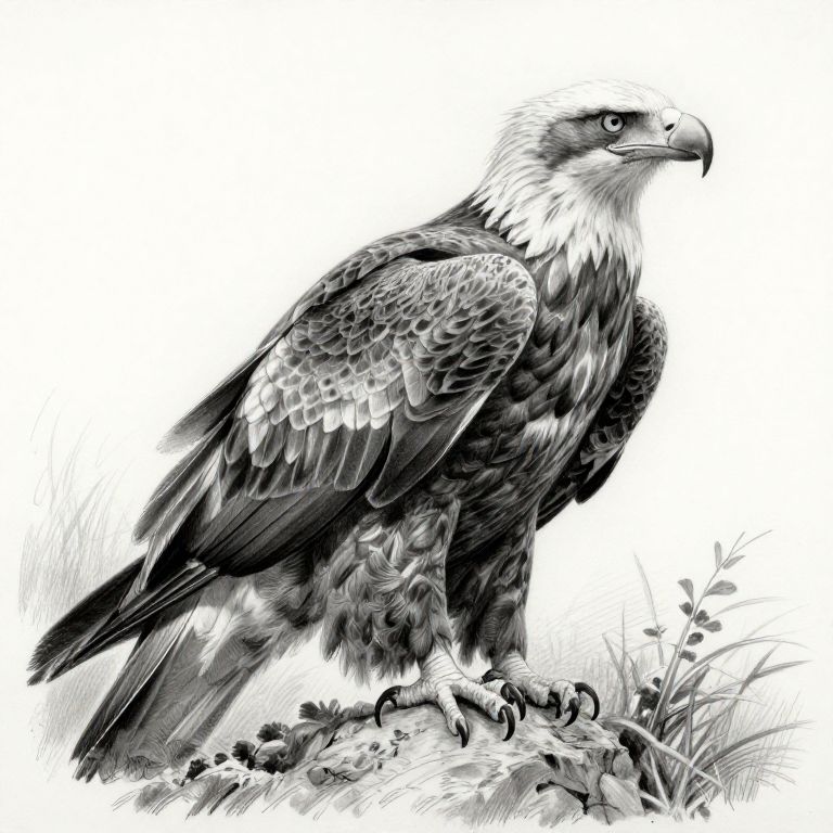 Eagle drawing realistic, detailed anatomy study, focused on muscular structure and feather layering, graphite pencil medium, with precise crosshatching and soft blending, perched on rocky outcrop with wild foliage, expressing resilience and natural beauty