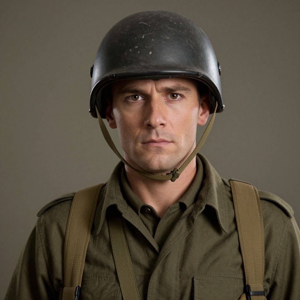 A man dressed in an army-inspired olive green uniform and helmet stares intensely into the camera, embodying a cinematic realism style with a heroic and resolute expression. The detailed textures of his costume and the muted background add to the dramatic and authentic military atmosphere.