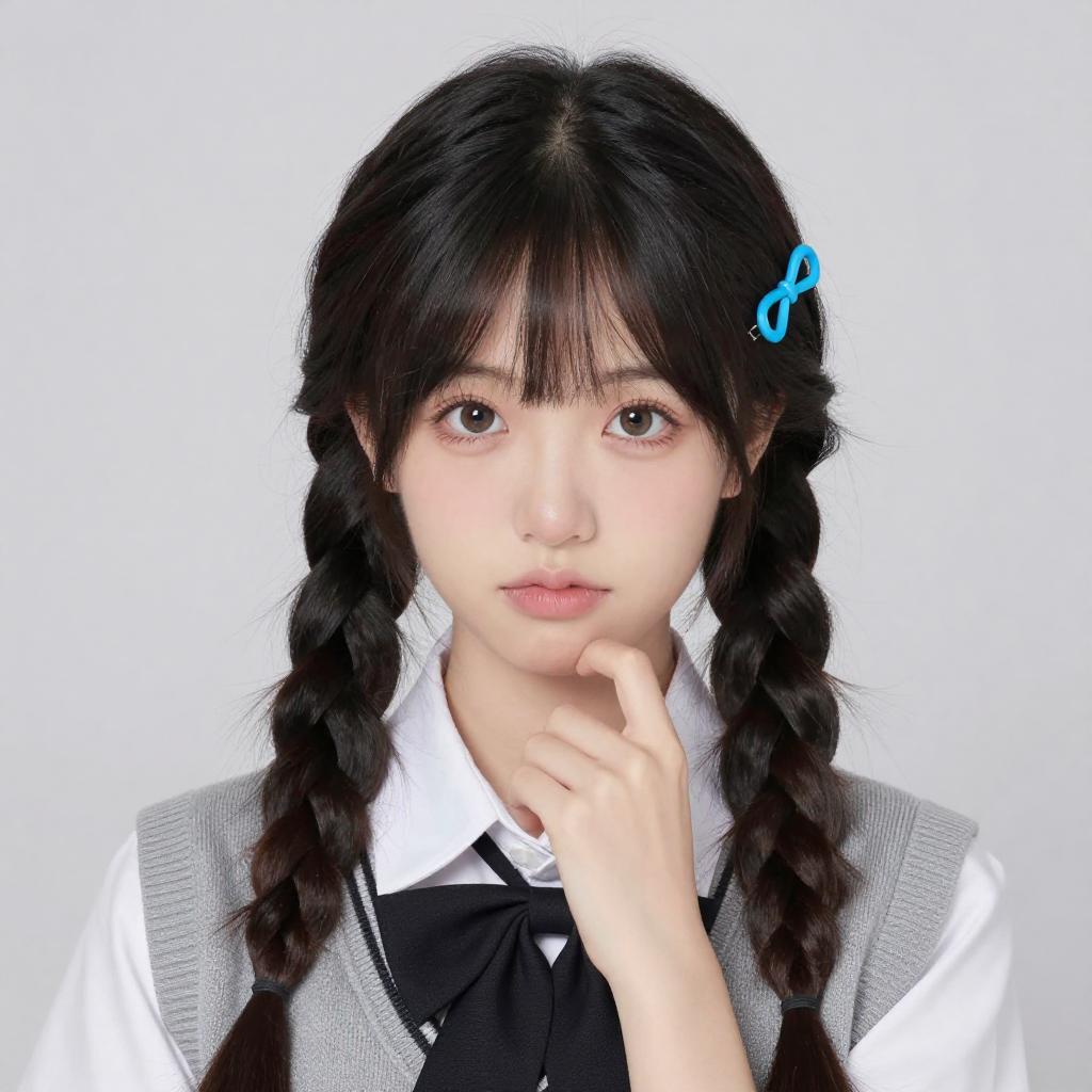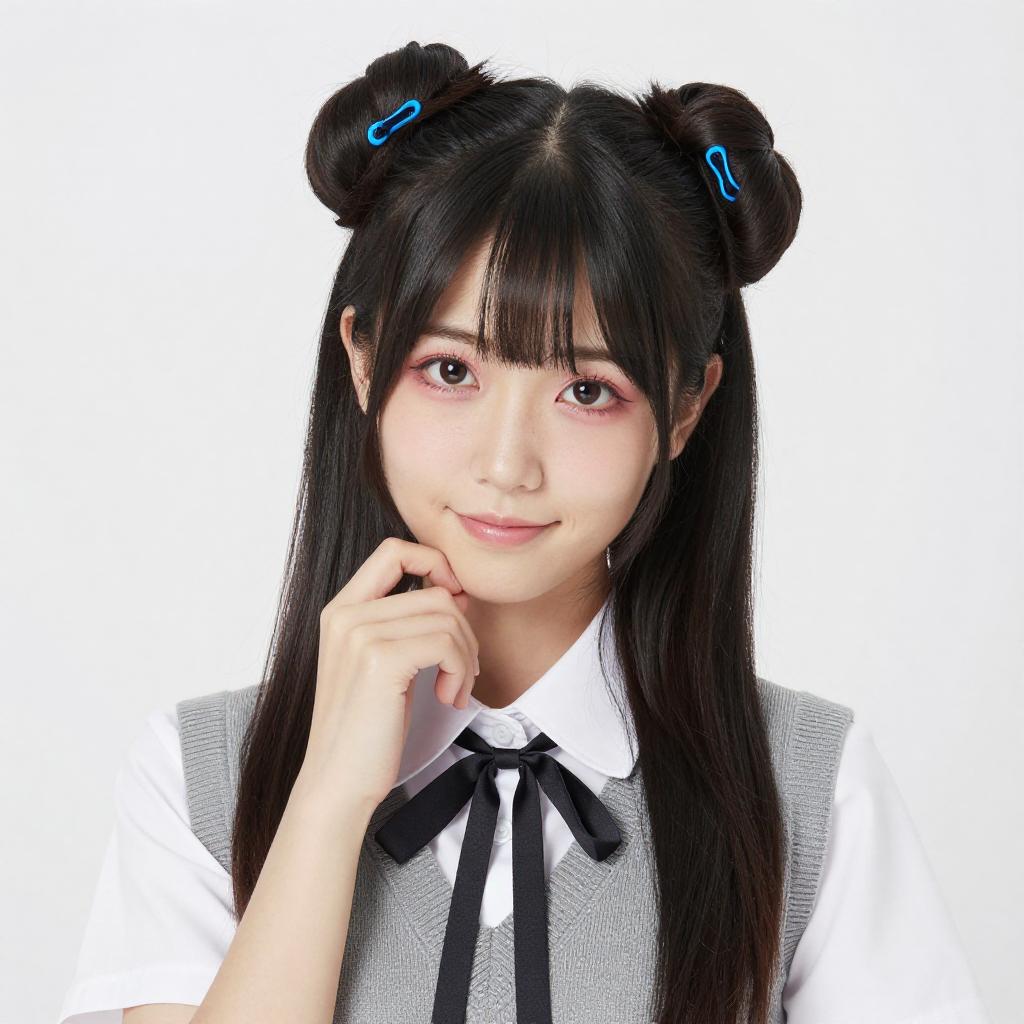 Photograph of an Asian woman with long black hair in twin buns, wearing a white shirt, black vest, and black skirt, squatting with one hand near her face. She has blue hair accessories and white socks with black shoes. Bright white background.