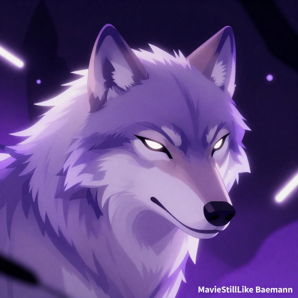 Digital illustration of a glowing, purple and white anthropomorphic wolf with intense, closed eyes. Background features dark silhouettes and bright, neon purple and white lights. The wolf's face is in profile, showing sharp, defined features. The artist's "MovieStillLikeBaermann" is in the bottom right corner.