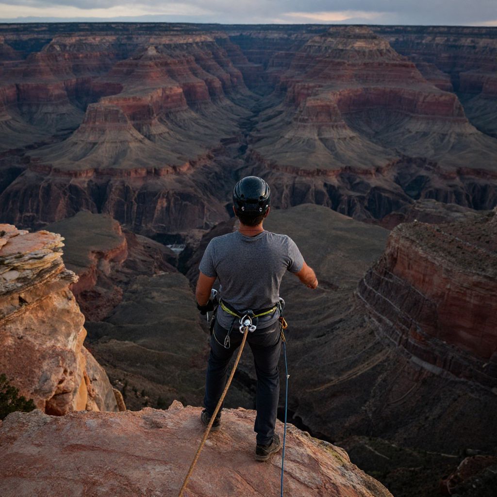 Photograph of a male rock climber with a medium build, wearing a black helmet, gray shirt, and black climbing harness with ropes, standing on a rocky ledge overlooking the Grand Canyon. He is facing away from the camera, with his back to the vast, multicolored canyon landscape. The canyon features layered rock formations in shades of red, orange, and brown, with a dramatic sky overhead. The climber's hands rest on his harness, and he holds a climbing rope. The image captures the expansive, rugged beauty of the canyon and the climber's sense of adventure and challenge.