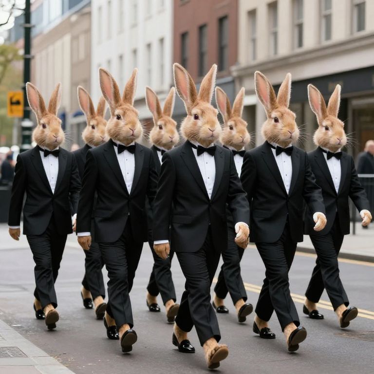Urban street scene featuring seven anthropomorphic rabbits dressed in formal black tuxedos, walking in formation with confident strides, blending surreal whimsy with the mundane reality of city life.
