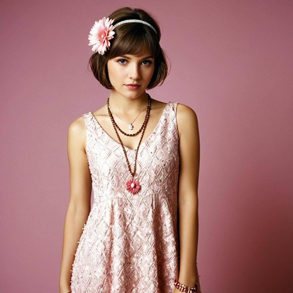 Portrait of a young woman with short brown hair and brown eyes wearing a light pink textured flapper-style dress. She accessorizes with flower-themed jewelry, including a long necklace with a pink flower pendant, a matching bracelet, and a pearl-like hairband with a large pink flower. The background is a solid dusty pink color, enhancing the soft and elegant appearance.