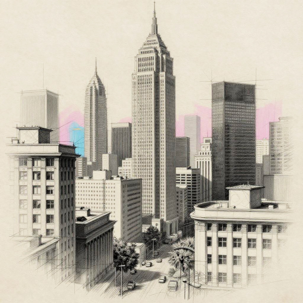 Free AI sketch generator producing intricate pencil sketches of urban cityscapes, blending realistic architectural details with abstract artistic lines, soft graphite textures on aged paper background, hints of blue and pink light blending in the scene.