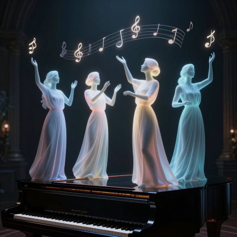 In a surreal 3D-rendered scene bathed in dramatic lighting, four ethereal figures in flowing robes stand atop a giant piano, their ghostly forms casting soft glows as they conduct invisible melodies, transforming their gestures into floating musical symbols against a dark, atmospheric backdrop.