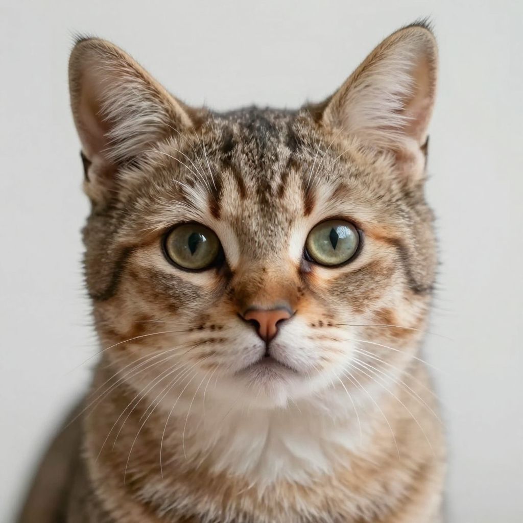 Photograph of a close-up, front-facing tabby cat with striking green eyes, detailed brown and black striped fur, and a white chin and chest. The cat's ears are pointed and alert, with light-colored fur inside. The background is a plain, bright white, making the cat's features the focal point. The cat's expression is neutral, with a slightly curious gaze. The image is highly detailed, capturing the texture of the cat's fur and the subtle color variations in its coat.
