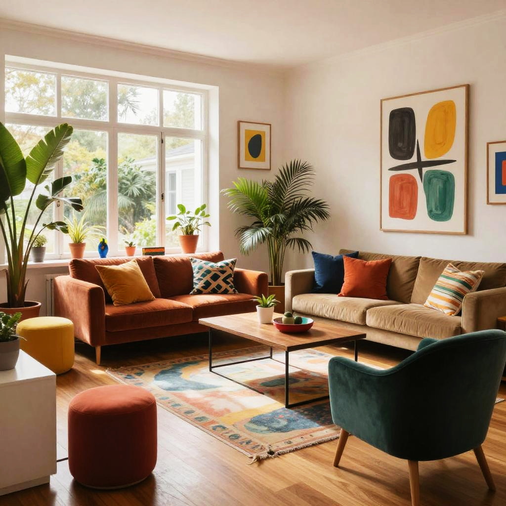 Vibrant living room filled with colorful modern furniture, large windows letting natural light flood in, bold abstract art on walls, lush indoor plants, warm wooden flooring