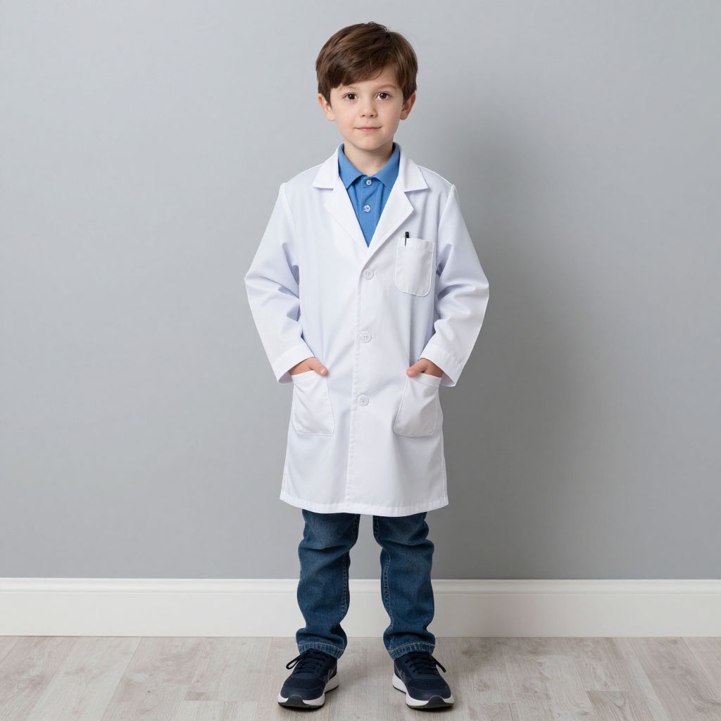 Kid Doctor Costume, boy in a lab coat standing with his hands in his pockets