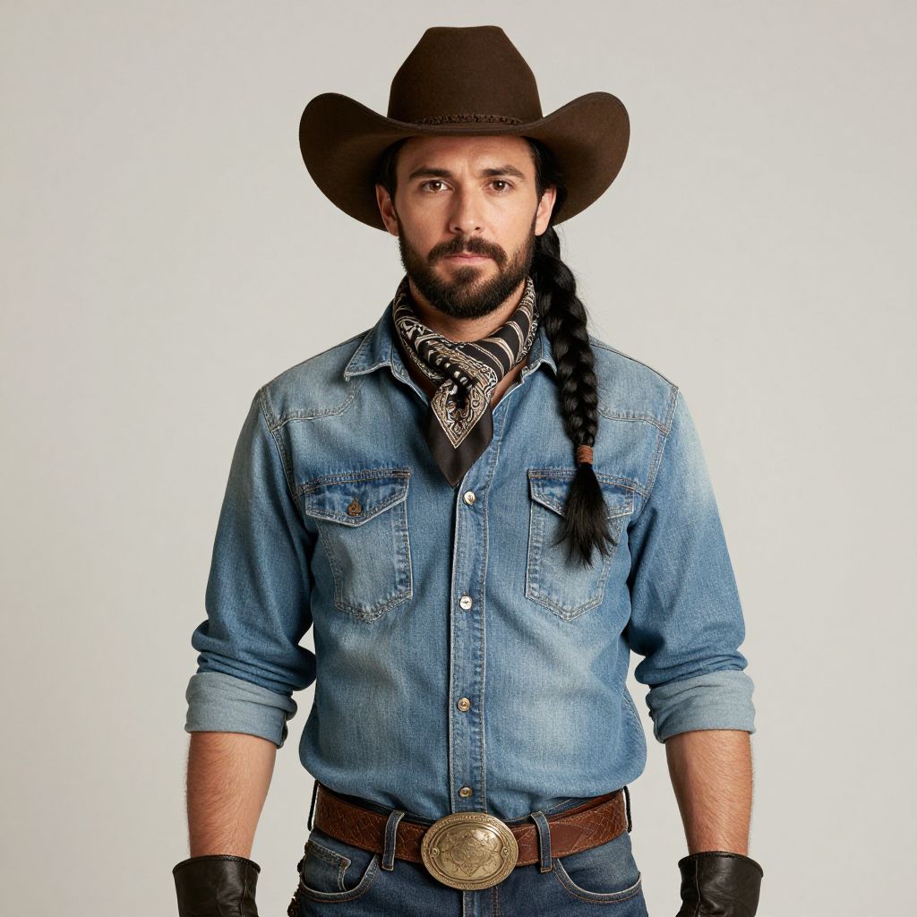 Photograph of a bearded man with medium-dark skin, wearing a brown cowboy hat, long black braid, and a blue denim shirt with rolled sleeves. He has a black and white checkered bandana around his neck, brown leather belt with a large gold buckle, and black gloves. His expression is neutral, with direct eye contact. The background is plain white, making the subject stand out. The image has a crisp, high-contrast style, highlighting the textures of the denim and leather.
