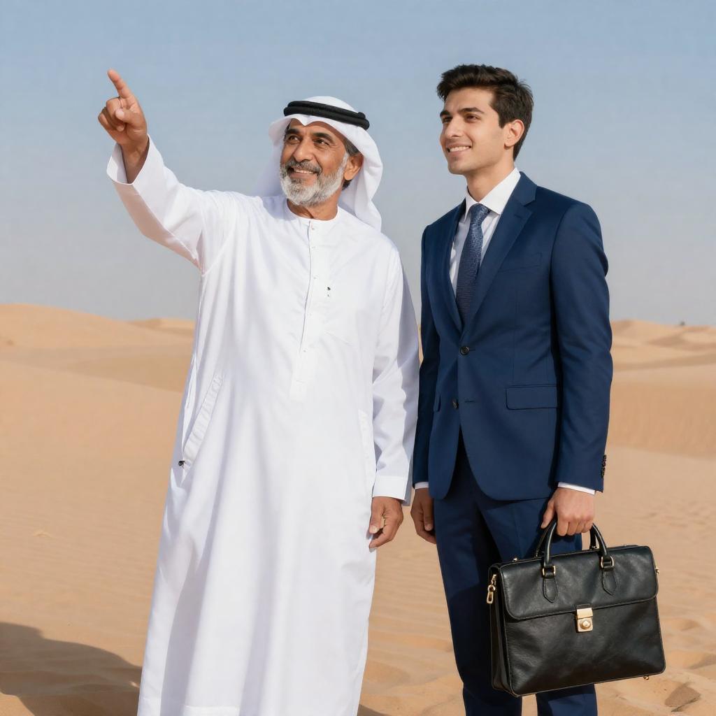 Photograph of a desert scene with a blue and white car labeled "Dunes Racing Team." Six men in traditional Middle Eastern attire sit and stand around the car, with two camels to the right. One camel stands next to an open car hood. Clear blue sky, barren trees, and sandy ground. Men's faces are neutral or smiling.
