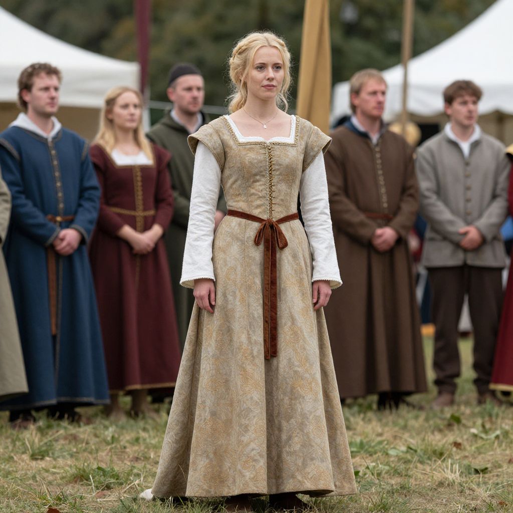 Medieval faire costume, woman in medieval dress standing in front of a crowd of people