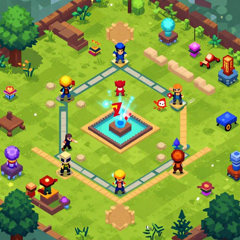 Pixel art of a vibrant, top-down RPG battle arena with colorful characters, glowing blue water pool, and various magical objects around.