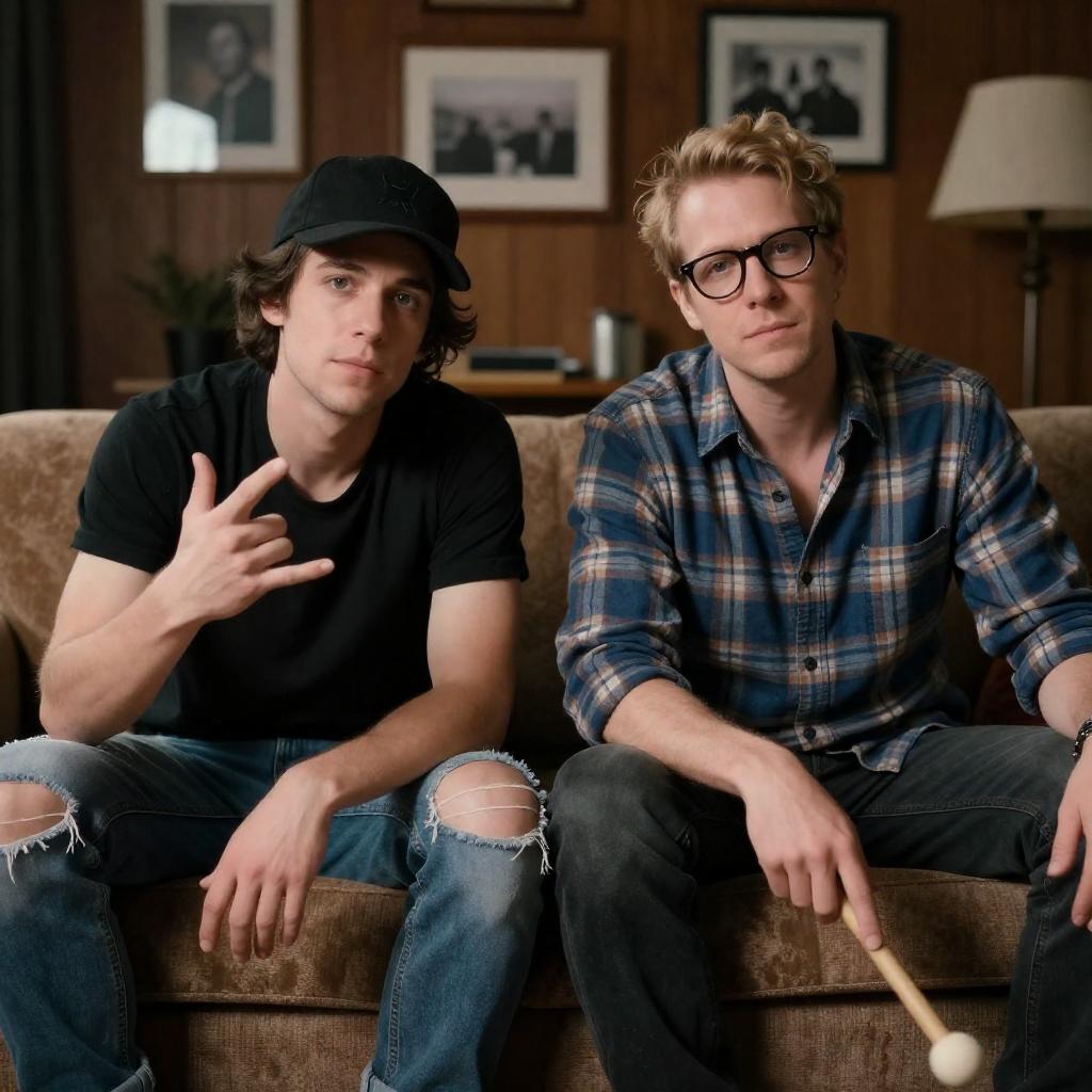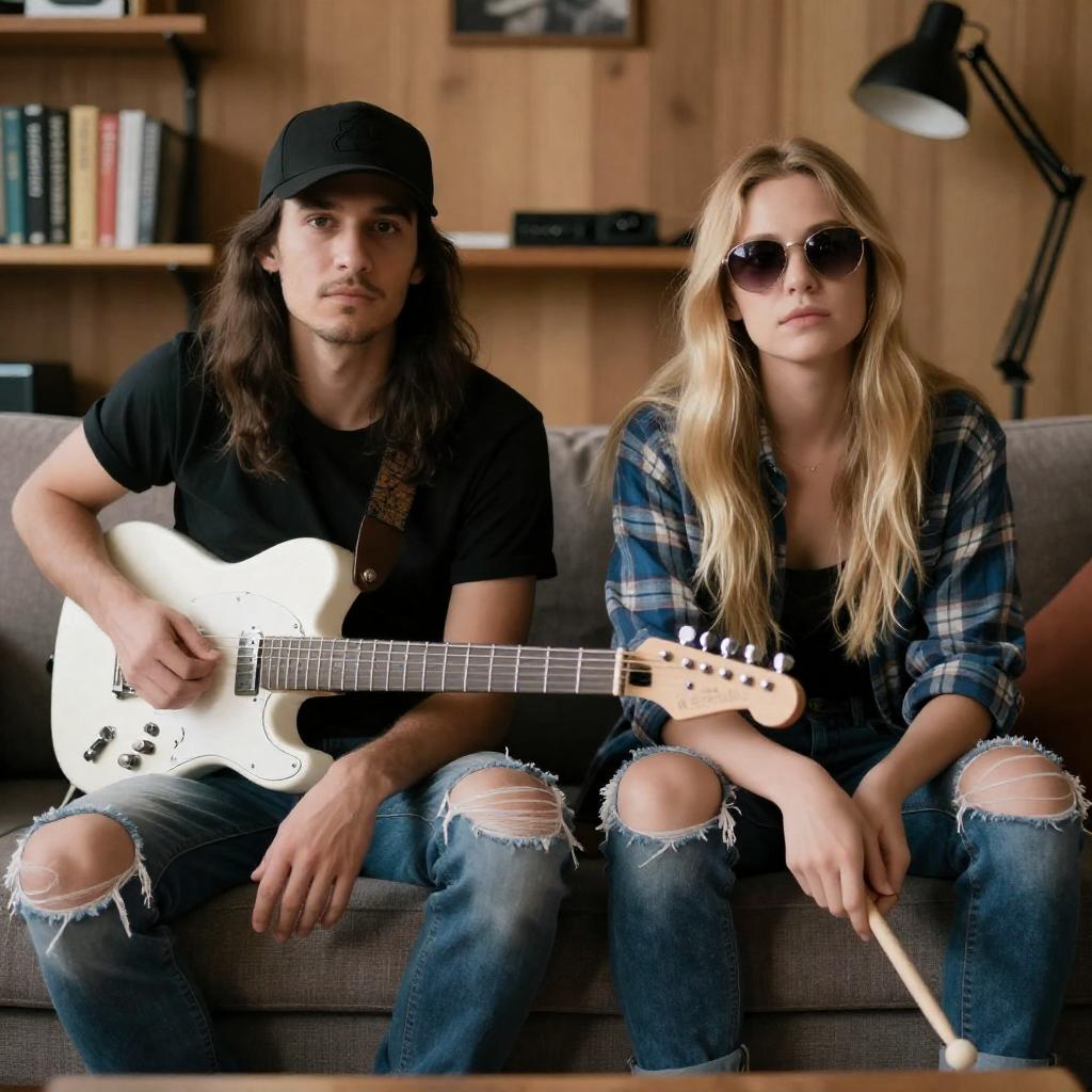 Photograph of two musicians sitting on a couch. The man on the left has long dark hair, wears a black t-shirt, black cap, and ripped jeans, holding a white electric guitar. The woman on the right has blonde hair, wears sunglasses, a blue plaid shirt, and ripped jeans, holding a drumstick. Background includes wooden walls, shelves with books and instruments, and black desk lamps. Both musicians have neutral facial expressions.