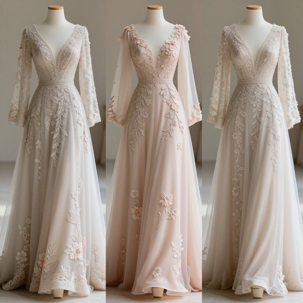 Photograph of three identical ivory ball gowns displayed on white mannequins, each with a deep V-neckline and long, sheer lace sleeves. The dresses feature intricate floral embroidery in soft pink and white, extending down the bodice and flowing into the skirt. The lace sleeves are slightly puffed, adding a delicate, romantic touch. The gowns have a fitted waist with a subtle, beaded belt, and the skirts cascade gracefully to the floor. The background is a simple, gray, and slightly out-of-focus indoor setting, emphasizing the elegant and detailed design of the dresses.