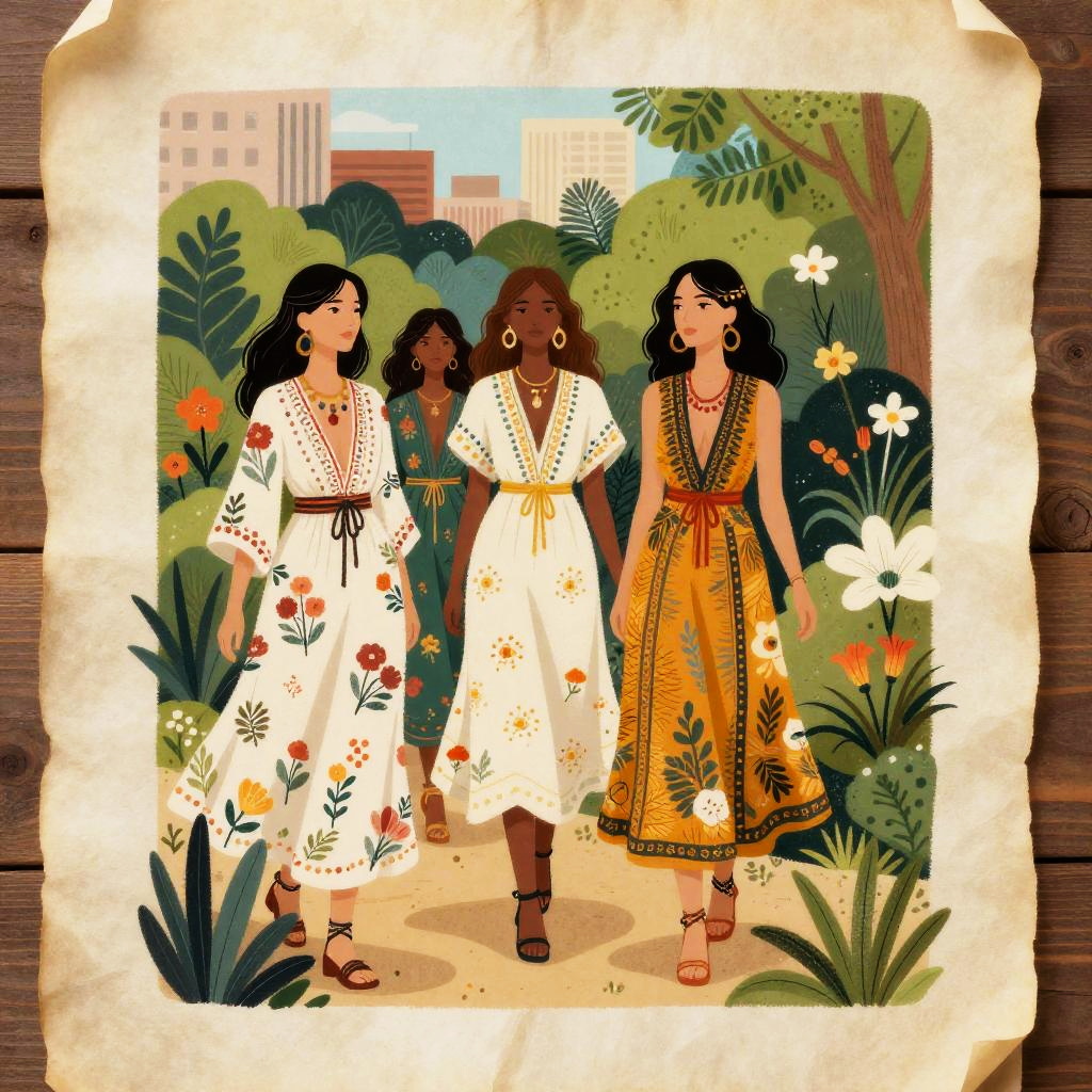 Illustration of four women wearing bohemian style flowy dresses with floral prints, walking in a lush hidden garden in an urban setting with city buildings in the background. The artwork features vibrant flat colors and a graphic novel style on an aged parchment background.