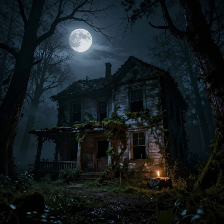 Photograph of a creepy, moonlit, abandoned, wooden house with a glowing lantern, surrounded by dark trees, under a full, bright moon.