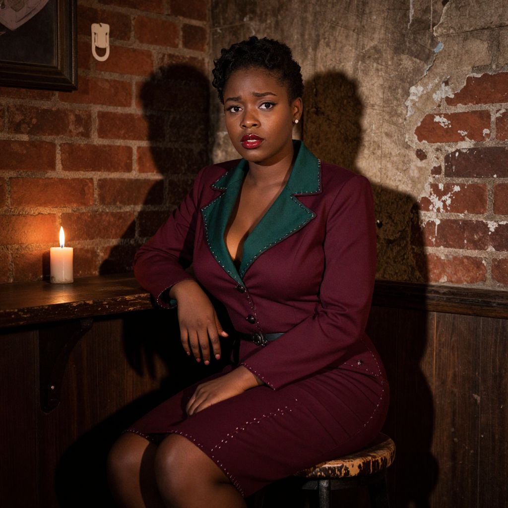 A vintage-style portrait of a young Black woman dressed as a 1930s blues singer, in a tailored, hand-stitched costume with deep maroon and emerald tones, her dark, expressive eyes full of emotion, sitting on a rustic wooden stool at a corner of a smoke-filled juke joint, the atmosphere humming with soulful music, candlelight casting long shadows on the cracked brick walls.. The woman has big tits and cute face
