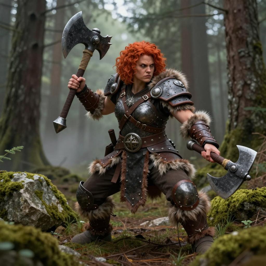 Female dwarf barbarian warrior, compact and muscular, braided ginger mohawk with shaved sides, intense battle glare wearing reinforced leather corset with metal studs and layered skirt panels and brandishing pair of heavy double-headed axes held at the ready, poised for battle in rock-strewn canyon path with shafts of sunlight filtering down, dynamic fantasy character art, rich colors, dramatic rim lighting