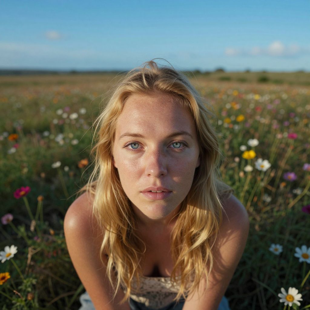 Photograph of a blonde woman with light blue eyes and fair skin, staring directly into the camera. She has wavy, shoulder-length hair and is wearing a strapless, patterned top. She is kneeling in a vibrant field of wildflowers, including white daisies and yellow blooms, under a clear blue sky. The background is slightly blurred, emphasizing her face. Her expression is neutral, and the sunlight highlights her features and the colorful flowers around her. The image has a natural, candid feel with a shallow depth of field.