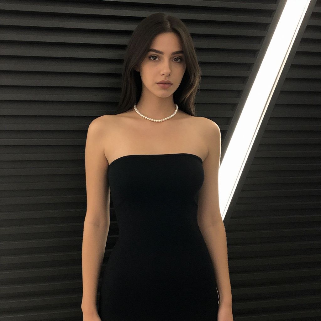 Photograph of a young woman with long, straight black hair and light olive skin standing against a black, horizontally slatted wall with a diagonal white light beam. She wears a strapless, form-fitting black dress and a single-strand pearl necklace. Her expression is neutral, and she gazes directly at the camera. The lighting highlights her smooth skin and the simplicity of her elegant outfit. The background is sleek and modern, emphasizing her classic yet contemporary look.