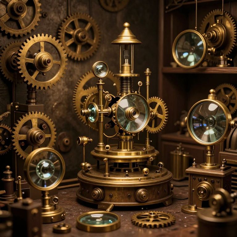 D'optique, whimsical steampunk workshop filled with intricate optical devices, brass gears, magnifying glasses, and rotating lenses, warm sepia tones with rich textures, imaginative and cozy setting with a touch of fantasy
