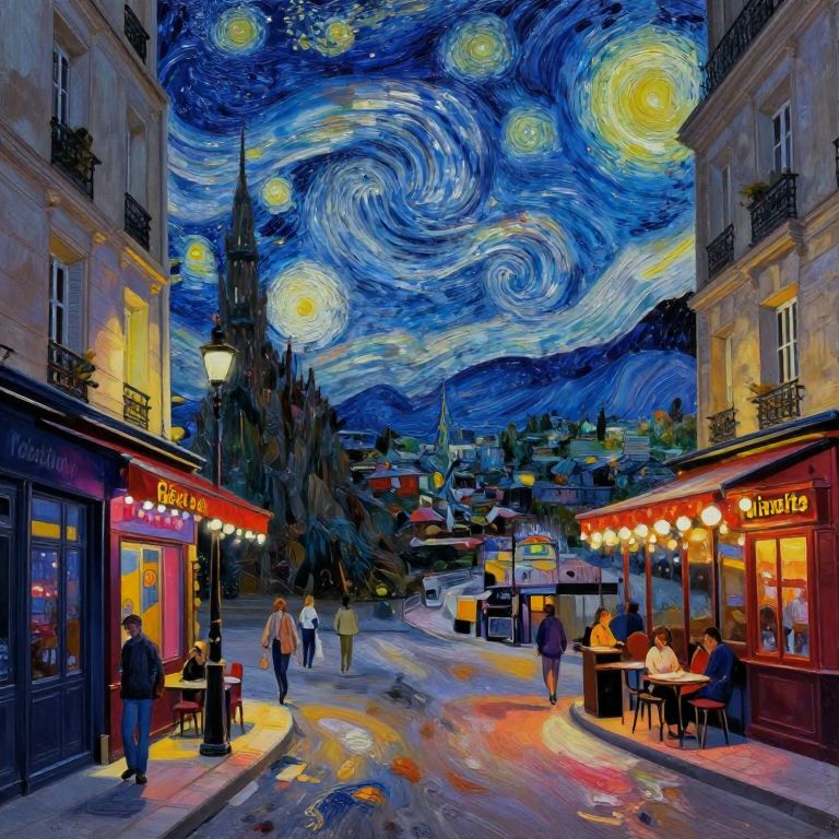 Astrobiology Oil paint night sky with paris night streets, shops, cafe, 80s,ultra detailed, realistic, 8K,