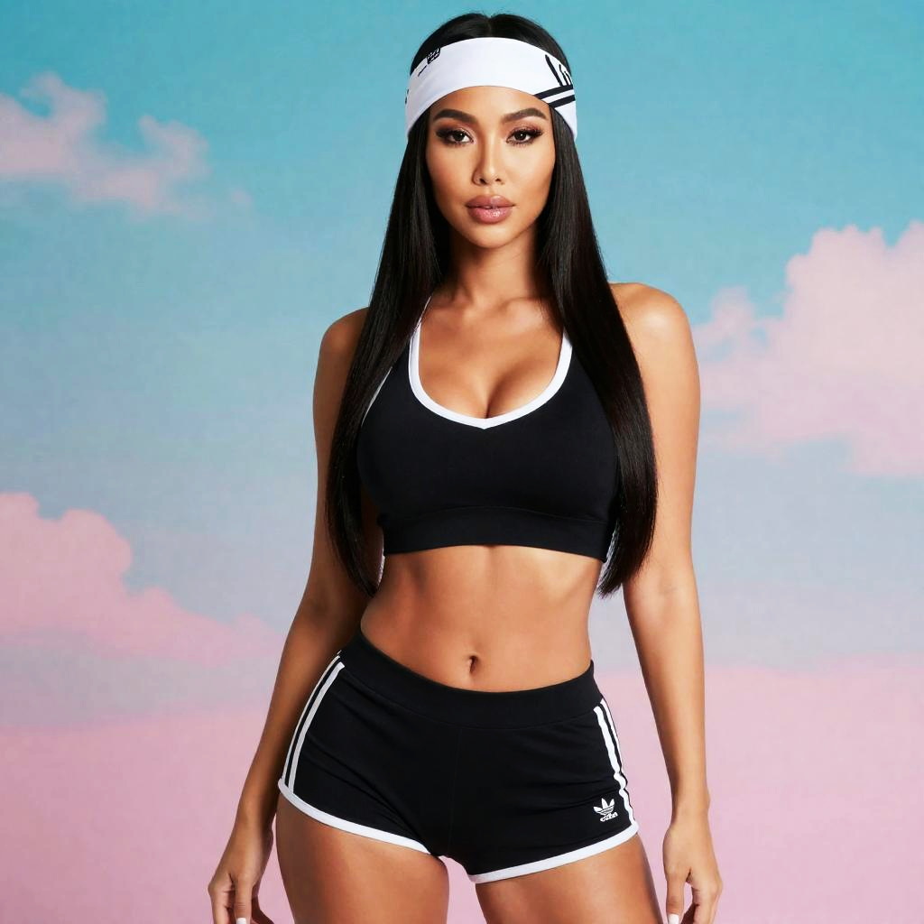 Full body shot of an elegant Asian woman with light tan skin and long straight black hair. She is wearing a black sports bra crop top, matching black Adidas shorts with white stripes, and a white and black bandana on her head. The background features a psychedelic teal and pink sky, highlighting her slim, curvy body and confident posture.